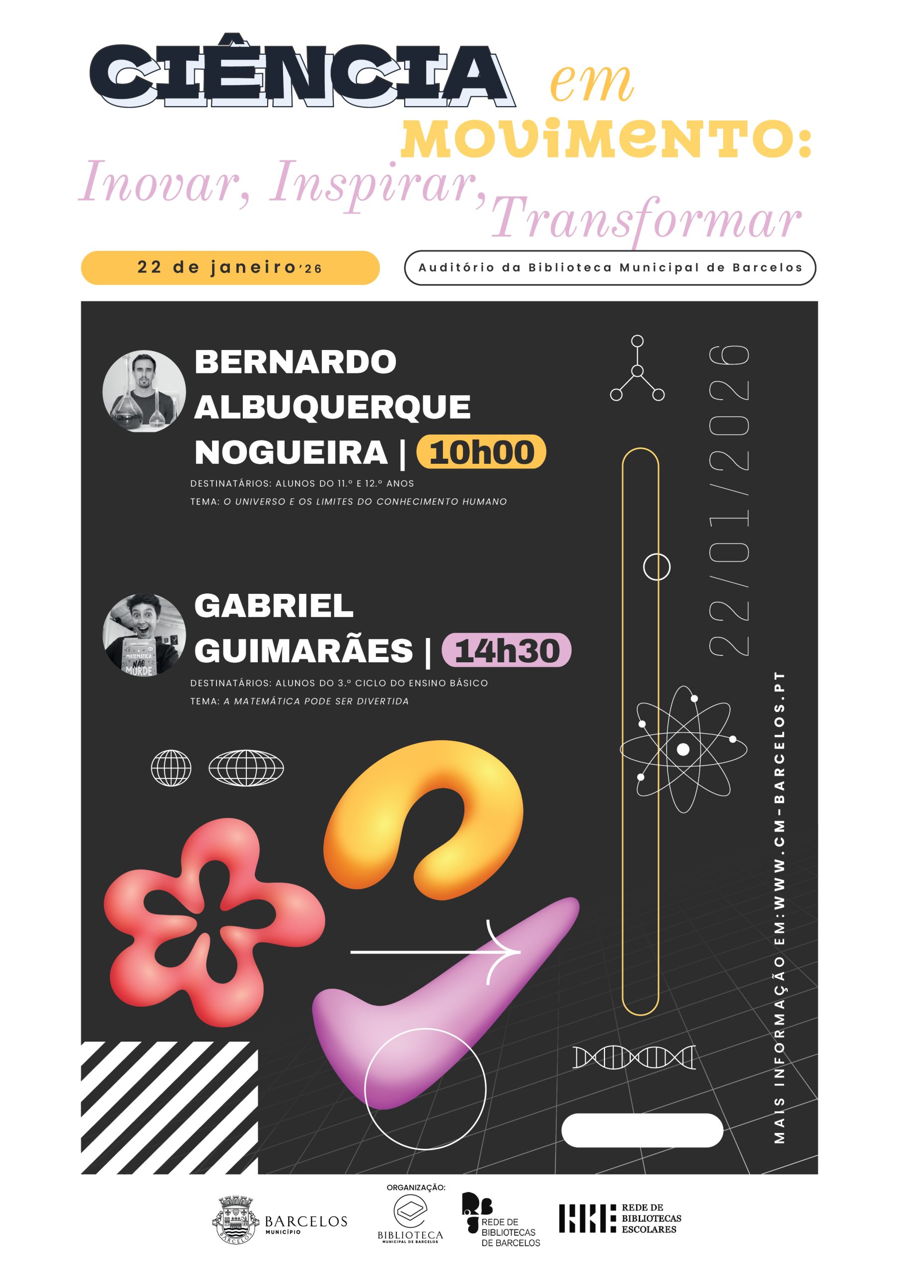 No âmbito da sua programação educativa dirigida às escolas, a Biblioteca Municipal de Barcelos promove, no próximo dia 22 de janeiro, duas conferências de divulgação científica integradas na temática “Ciência em Movimento: Inovar, Inspirar, Transformar”. As iniciativas terão lugar no auditório da Biblioteca e destinam-se a diferentes níveis de ensino.